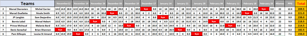 | Caron | L | L | L | L | L | L | L | L | W | L | L | L | L | W | W | 3 -12 | ||||